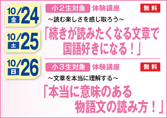 小2生対象「続きが読みたくなる文章で国語好きになる!」 詳細・お申し込みはこちら 小3生対象「本当に意味のある物語文の読み方!」 詳細・お申し込みはこちら