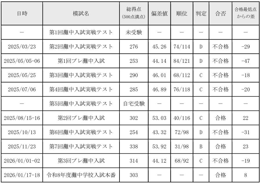 灘中関連模試は不合格が多く、結局合格は2回だけでした。最後の第3回プレ灘中入試も19点足らずの不合格でした。それでも西川(大)先生は大丈夫と励ましてくれました。この時期のテストゼミは一定の手応えがあり結果も悪くなかったので最後まで頑張ろうと思いました。